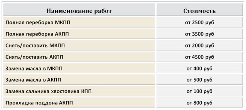 Прайс-лист на ремонт АКПП и МКПП в Истре