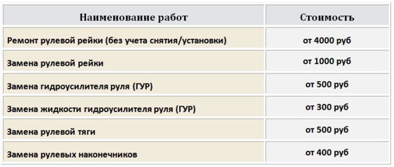 Прайс-лист с ценами на ремонт рулевой рейки в Истре